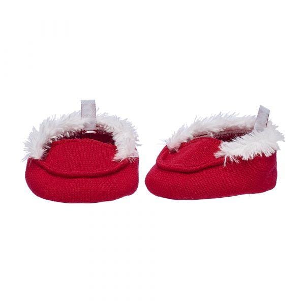 Keep your furry friend’s paws warm and cozy in these cute red knit slippers featuring a classic faux fur trim.