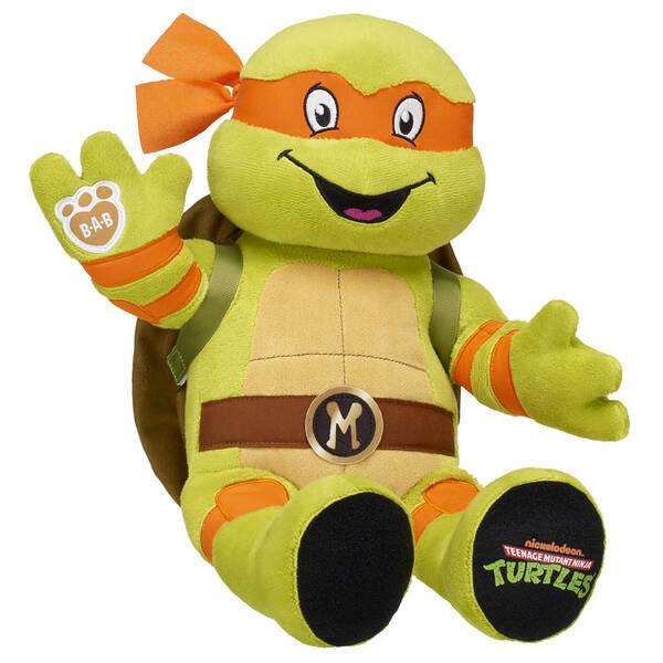 The class clown of the TMNT sewer lair is here in furry friend form! This officially licensed Michelangelo TMNT plush comes with his orange eye mask and brown belt built into his green fur. Add Michelangelo’s plush nunchucks and a Teenage Mutant Ninja Turtle sound chip to get him ready to prank, snack and kick butt!